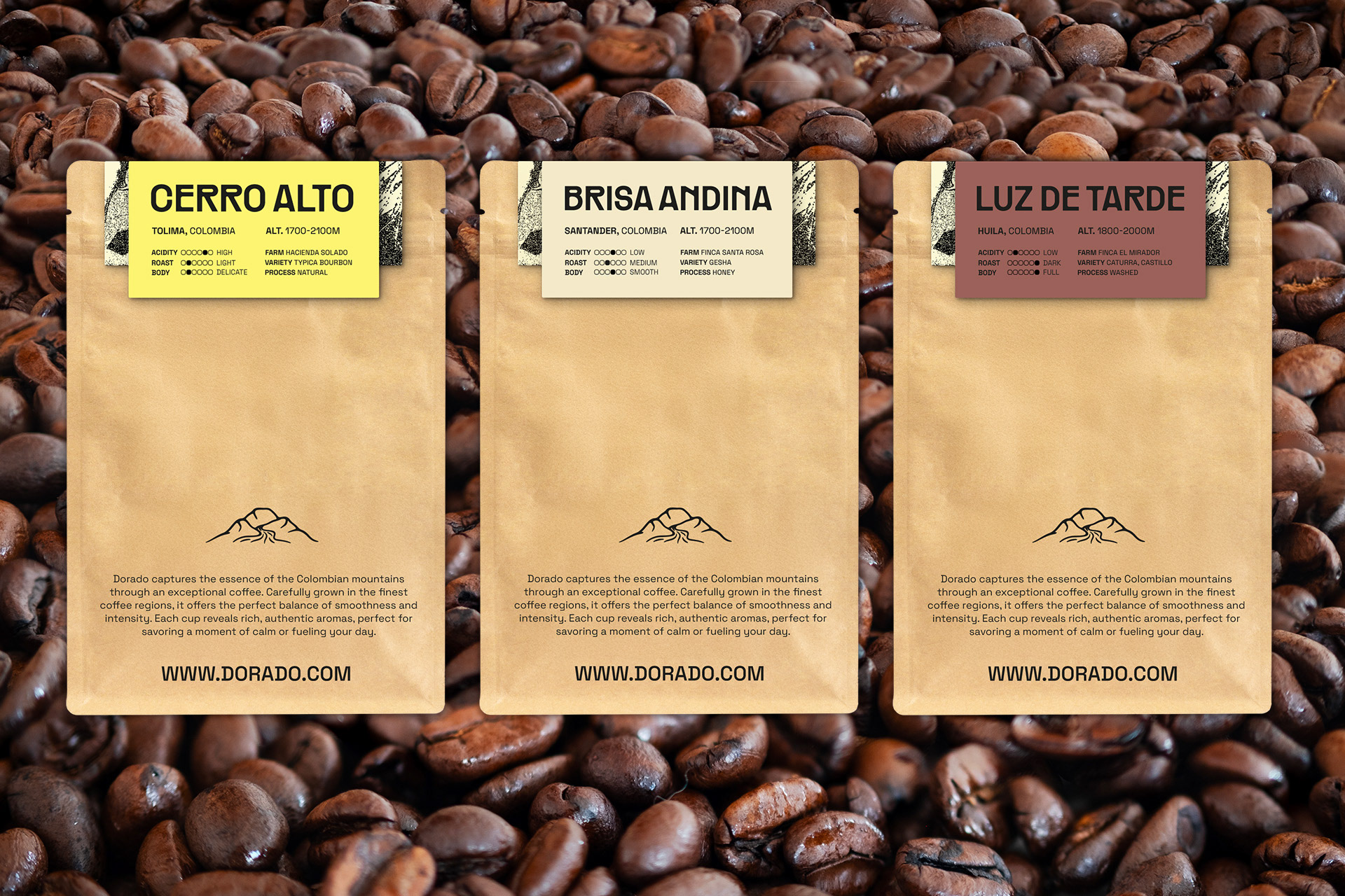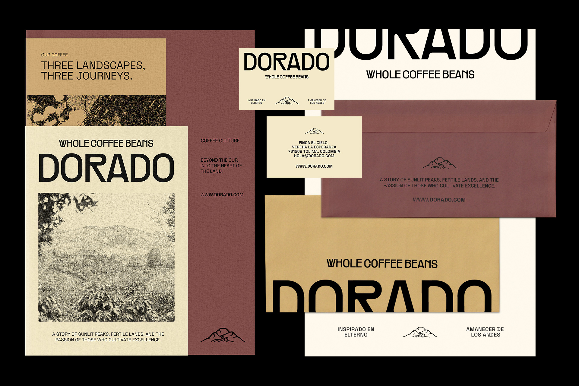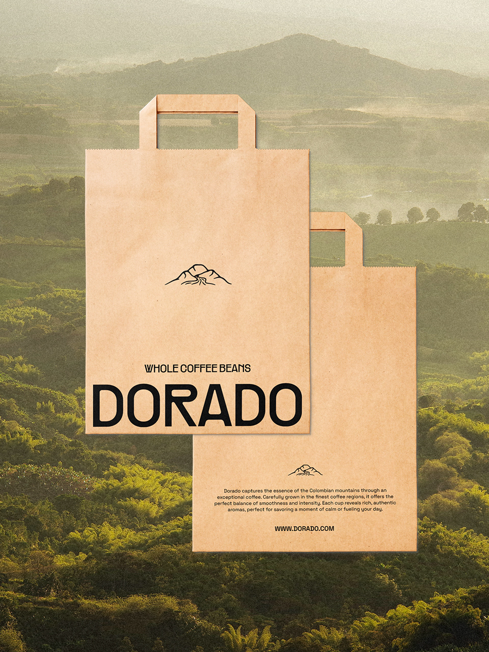 Dorado est un concept de marque de café inspiré des paysages colombiens. Le projet explore une identité visuelle et un système d'emballage ancrés dans l'authenticité, le savoir-faire artisanal et le rythme naturel, puisant son inspiration dans les textures des sacs d'exportation, la chaleur du soleil matinal et la profondeur des Andes.